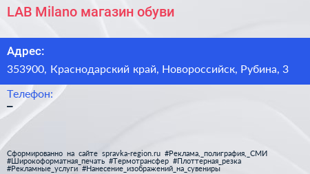 LAB Milano, магазин обуви по адресу 353900, Краснодарский край, Новороссийск, Рубина, 3 в дальнейшем Организация, размещена в следующих категориях: