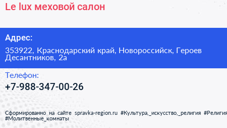 Le lux, меховой салон по адресу 353922, Краснодарский край, Новороссийск, Героев Десантников, 2а в дальнейшем Организация, размещена в следующих категориях: