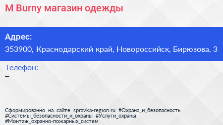 M.Burny, магазин одежды по адресу 353900, Краснодарский край, Новороссийск, Бирюзова, 3 в дальнейшем Организация, размещена в следующих категориях: