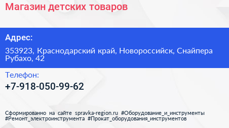 Магазин детских товаров по адресу 353923, Краснодарский край, Новороссийск, Снайпера Рубахо, 42 в дальнейшем Организация, размещена в следующих категориях: