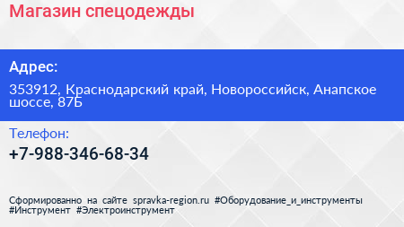 Магазин спецодежды по адресу 353912, Краснодарский край, Новороссийск, Анапское шоссе, 87Б в дальнейшем Организация, размещена в следующих категориях: