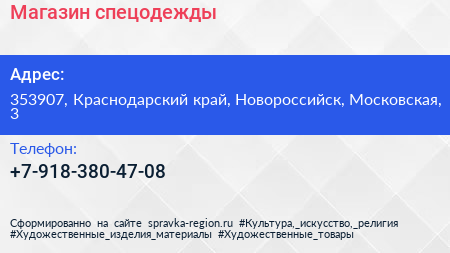 Магазин спецодежды по адресу 353907, Краснодарский край, Новороссийск, Московская, 3 в дальнейшем Организация, размещена в следующих категориях: