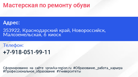 Мастерская по ремонту обуви по адресу 353922, Краснодарский край, Новороссийск, Малоземельская, 6 киоск в дальнейшем Организация, размещена в следующих категориях: