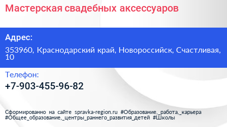Мастерская свадебных аксессуаров по адресу 353960, Краснодарский край, Новороссийск, Счастливая, 10 в дальнейшем Организация, размещена в следующих категориях: