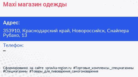 Maxi, магазин одежды по адресу 353910, Краснодарский край, Новороссийск, Снайпера Рубахо, 13 в дальнейшем Организация, размещена в следующих категориях: