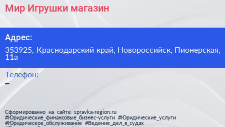 Мир Игрушки, магазин по адресу 353925, Краснодарский край, Новороссийск, Пионерская, 11а в дальнейшем Организация, размещена в следующих категориях: