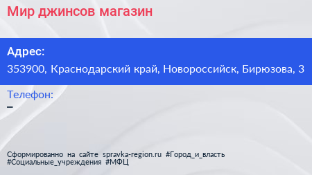 Мир джинсов, магазин по адресу 353900, Краснодарский край, Новороссийск, Бирюзова, 3 в дальнейшем Организация, размещена в следующих категориях: