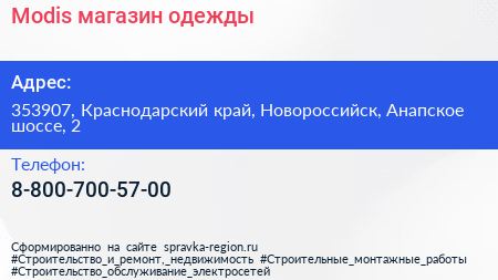 Modis, магазин одежды по адресу 353907, Краснодарский край, Новороссийск, Анапское шоссе, 2 в дальнейшем Организация, размещена в следующих категориях: