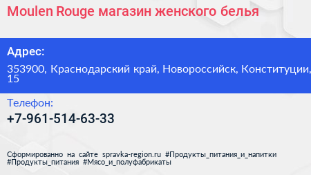 Moulen Rouge, магазин женского белья по адресу 353900, Краснодарский край, Новороссийск, Конституции, 15 в дальнейшем Организация, размещена в следующих категориях: