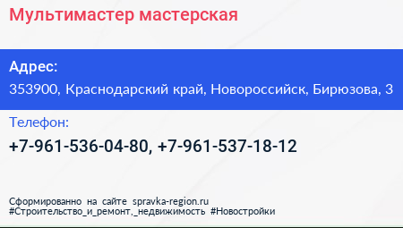 Мультимастер, мастерская по адресу 353900, Краснодарский край, Новороссийск, Бирюзова, 3 в дальнейшем Организация, размещена в следующих категориях: