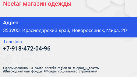 Nectar, магазин одежды по адресу 353900, Краснодарский край, Новороссийск, Мира, 20 в дальнейшем Организация, размещена в следующих категориях: