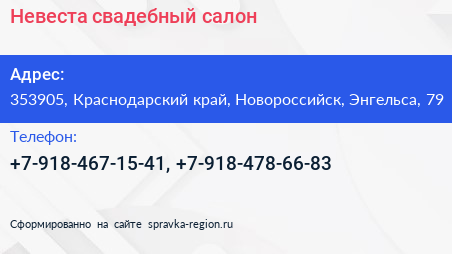 Невеста, свадебный салон по адресу 353905, Краснодарский край, Новороссийск, Энгельса, 79 в дальнейшем Организация, размещена в следующих категориях: