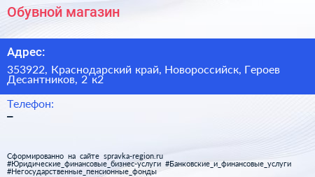 Обувной магазин по адресу 353922, Краснодарский край, Новороссийск, Героев Десантников, 2 к2 в дальнейшем Организация, размещена в следующих категориях: