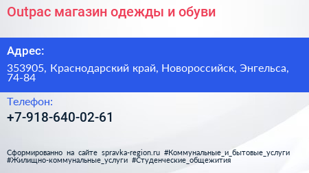 Outpac, магазин одежды и обуви по адресу 353905, Краснодарский край, Новороссийск, Энгельса, 74-84 в дальнейшем Организация, размещена в следующих категориях:
