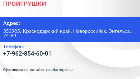 ПРОИГРУШКИ по адресу 353905, Краснодарский край, Новороссийск, Энгельса, 74-84 в дальнейшем Организация, размещена в следующих категориях: