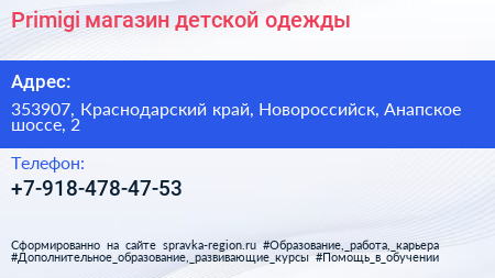 Primigi, магазин детской одежды по адресу 353907, Краснодарский край, Новороссийск, Анапское шоссе, 2 в дальнейшем Организация, размещена в следующих категориях: