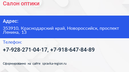 Салон оптики по адресу 353910, Краснодарский край, Новороссийск, проспект Ленина, 13 в дальнейшем Организация, размещена в следующих категориях: