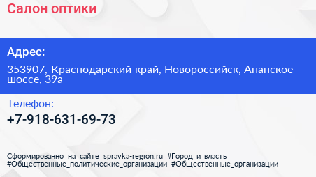 Салон оптики по адресу 353907, Краснодарский край, Новороссийск, Анапское шоссе, 39а в дальнейшем Организация, размещена в следующих категориях: