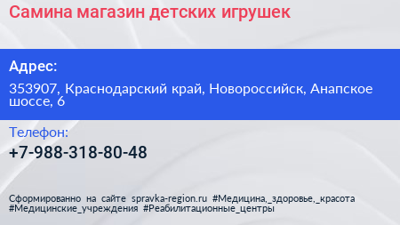 Самина, магазин детских игрушек по адресу 353907, Краснодарский край, Новороссийск, Анапское шоссе, 6 в дальнейшем Организация, размещена в следующих категориях: