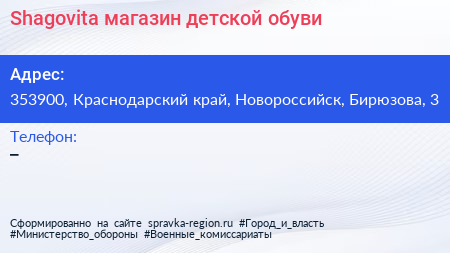 Shagovita, магазин детской обуви по адресу 353900, Краснодарский край, Новороссийск, Бирюзова, 3 в дальнейшем Организация, размещена в следующих категориях: