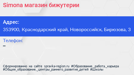 Simona, магазин бижутерии по адресу 353900, Краснодарский край, Новороссийск, Бирюзова, 3 в дальнейшем Организация, размещена в следующих категориях:
