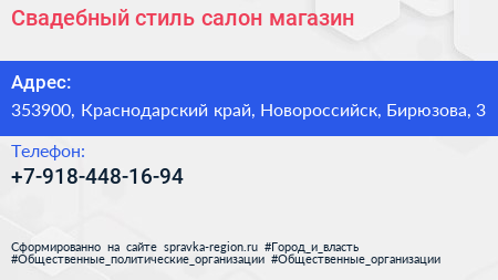 Свадебный стиль, салон-магазин по адресу 353900, Краснодарский край, Новороссийск, Бирюзова, 3 в дальнейшем Организация, размещена в следующих категориях: