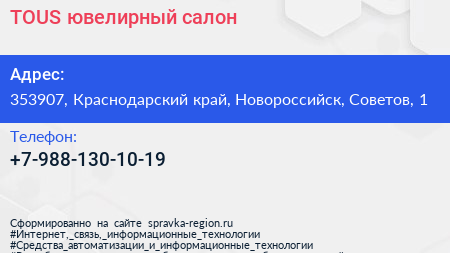 TOUS, ювелирный салон по адресу 353907, Краснодарский край, Новороссийск, Советов, 1 в дальнейшем Организация, размещена в следующих категориях: