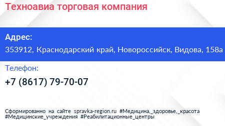Техноавиа, торговая компания по адресу 353912, Краснодарский край, Новороссийск, Видова, 158а в дальнейшем Организация, размещена в следующих категориях: