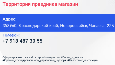 Территория праздника, магазин по адресу 353960, Краснодарский край, Новороссийск, Чапаева, 22Б в дальнейшем Организация, размещена в следующих категориях: