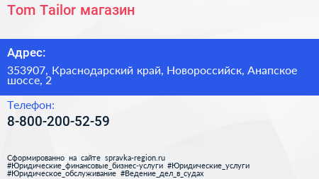 Tom Tailor, магазин по адресу 353907, Краснодарский край, Новороссийск, Анапское шоссе, 2 в дальнейшем Организация, размещена в следующих категориях: