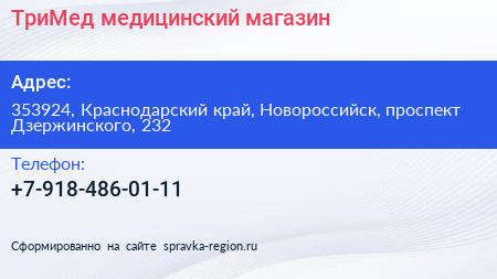 ТриМед, медицинский магазин по адресу 353924, Краснодарский край, Новороссийск, проспект Дзержинского, 232 в дальнейшем Организация, размещена в следующих категориях: