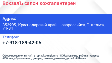 ВокзалЪ, салон кожгалантереи по адресу 353905, Краснодарский край, Новороссийск, Энгельса, 74-84 в дальнейшем Организация, размещена в следующих категориях: