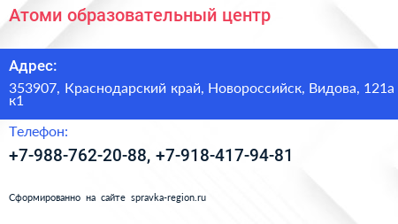 Атоми, образовательный центр по адресу 353907, Краснодарский край, Новороссийск, Видова, 121а к1 в дальнейшем Организация, размещена в следующих категориях: