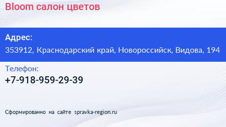 Bloom, салон цветов по адресу 353912, Краснодарский край, Новороссийск, Видова, 194 в дальнейшем Организация, размещена в следующих категориях: