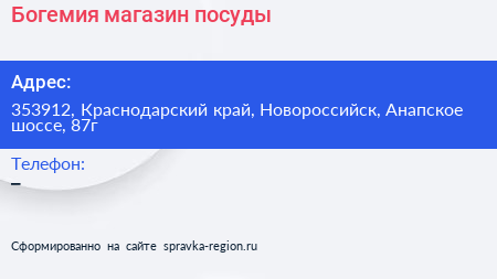 Богемия, магазин посуды по адресу 353912, Краснодарский край, Новороссийск, Анапское шоссе, 87г в дальнейшем Организация, размещена в следующих категориях: