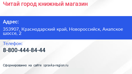 Читай город, книжный магазин по адресу 353907, Краснодарский край, Новороссийск, Анапское шоссе, 2 в дальнейшем Организация, размещена в следующих категориях: