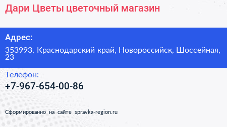 Дари Цветы, цветочный магазин по адресу 353993, Краснодарский край, Новороссийск, Шоссейная, 23 в дальнейшем Организация, размещена в следующих категориях: