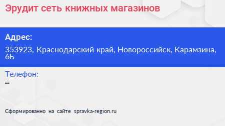 Эрудит, сеть книжных магазинов по адресу 353923, Краснодарский край, Новороссийск, Карамзина, 6Б в дальнейшем Организация, размещена в следующих категориях: