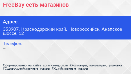FreeBay, сеть магазинов по адресу 353907, Краснодарский край, Новороссийск, Анапское шоссе, 12 в дальнейшем Организация, размещена в следующих категориях: