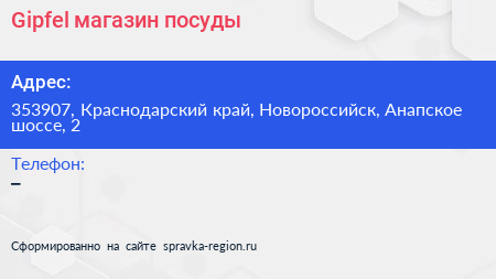 Gipfel, магазин посуды по адресу 353907, Краснодарский край, Новороссийск, Анапское шоссе, 2 в дальнейшем Организация, размещена в следующих категориях: