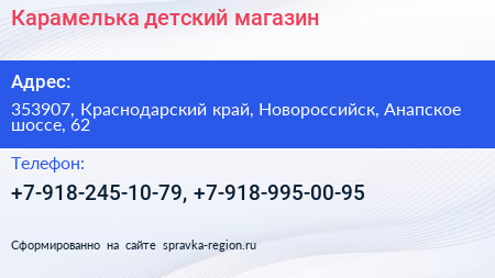 Карамелька, детский магазин по адресу 353907, Краснодарский край, Новороссийск, Анапское шоссе, 62 в дальнейшем Организация, размещена в следующих категориях: