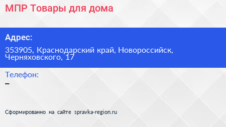 МПР Товары для дома по адресу 353905, Краснодарский край, Новороссийск, Черняховского, 17 в дальнейшем Организация, размещена в следующих категориях: