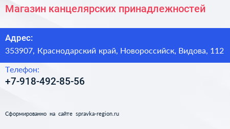 Магазин канцелярских принадлежностей по адресу 353907, Краснодарский край, Новороссийск, Видова, 112 в дальнейшем Организация, размещена в следующих категориях: