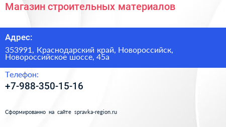 Магазин строительных материалов по адресу 353991, Краснодарский край, Новороссийск, Новороссийское шоссе, 45а в дальнейшем Организация, размещена в следующих категориях: