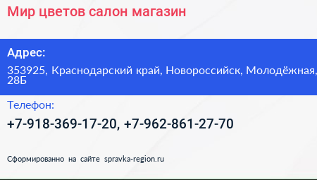 Мир цветов, салон-магазин по адресу 353925, Краснодарский край, Новороссийск, Молодёжная, 28Б в дальнейшем Организация, размещена в следующих категориях: