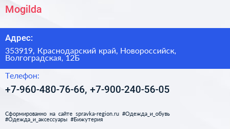 Mogilda по адресу 353919, Краснодарский край, Новороссийск, Волгоградская, 12Б в дальнейшем Организация, размещена в следующих категориях: