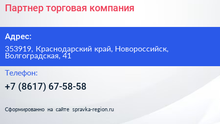 Партнер, торговая компания по адресу 353919, Краснодарский край, Новороссийск, Волгоградская, 41 в дальнейшем Организация, размещена в следующих категориях: