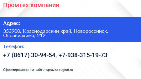 Промтех, компания по адресу 353900, Краснодарский край, Новороссийск, Осоавиахима, 212 в дальнейшем Организация, размещена в следующих категориях: