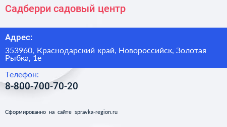 Садберри, садовый центр по адресу 353960, Краснодарский край, Новороссийск, Золотая Рыбка, 1е в дальнейшем Организация, размещена в следующих категориях: