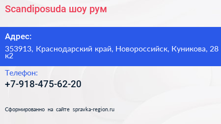 Scandiposuda, шоу-рум по адресу 353913, Краснодарский край, Новороссийск, Куникова, 28 к2 в дальнейшем Организация, размещена в следующих категориях: